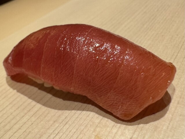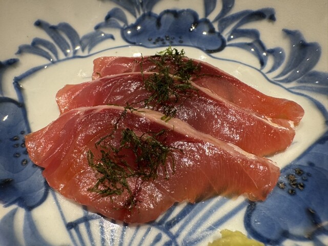左から ニタリ鯨の赤身(宮城・気仙沼沖) 上に浅葱と生姜を刻んだの ◎ バショウカジキ(神奈川 長谷川氏) 上に山葵、すじ青のり