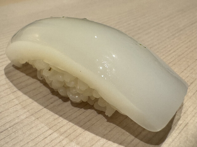 蛍烏賊 肝とうるい、こごみ、黄ニラのあんかけ 下に敷いたシャリと一緒に ◎