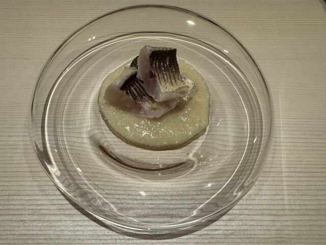 神経締め マナガツオ(愛媛 藤本氏) 白味噌とマナガツオの骨でとった出汁を合わせたソース、アクセントにエノキ ◎