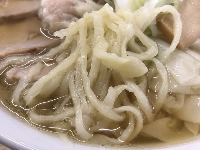 具材をかき分けて、ドンブリの底から持ち上げると太さの異なる麺は若干やわらかめ