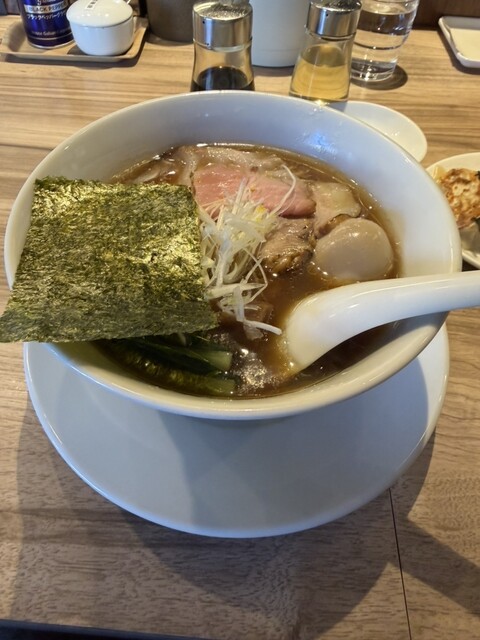 先に結論。今年最高の一杯のラーメンでした。店内は綺麗な昔ながらのコーヒー喫茶店のような雰囲気。1時半に入店。カウンター7席に他のお客さんは3名ほど。奥にはテーブル席がに卓。特製ラーメンを注文。麺の種類を聞かれ、しまった調べなかった。適当に細麺を選んでみる。メニュー見たら手もみ麺の太麺の方が売りだったのか?心配をよそに特製ラーメン到着。まずはスープから。透明な醤油系。一口目を口に入れて衝撃が走るのはあまりにも久しぶり。醤油ベースだが貝出汁だと思われる香りと旨みがほんのりしながら後からジワーっと優しい醤油味ベースのスープが味わえました。本当に素晴らしい。麺は細麺にしたけど小麦胚芽系でありながら啜るとツルツル入ってきます。チャーシューは数種類。鳥と豚。どちらも丁寧に作られた感あり、サイズもそこそこ。100名店に入っていないのが謎過ぎる一杯でした。実は影のMVPは自家製餃子では?ジューシーで家で作った餃子のような皮はもっちり、中身ぎっしり。餃子の価格の安さに改めて驚いた次第。今回途中下車してきましたがこんなに美味しいラーメンと餃子に出会えるとは。