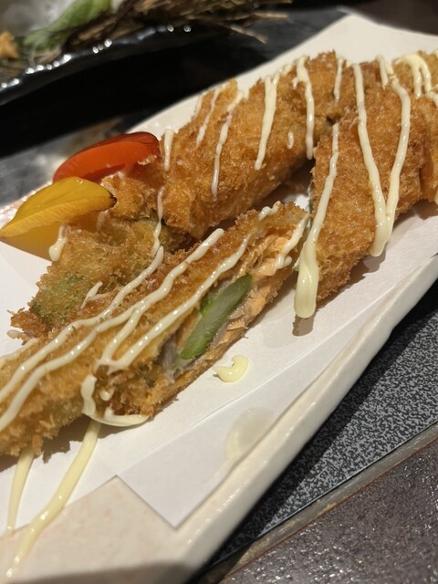 その他、山菜と筍天ぷら、しぐれ煮、山賊焼、サーモンアスパラ巻きフライ、赤身握り、冷やしトマトを頼みました。信州林檎を使った生おろし林檎サワーなど飲み物も美味しい。
