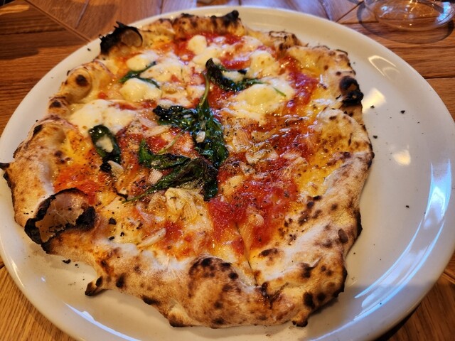 マルゲリータとマリナーラのハーフ&ハーフは、定番のピザでこれがまず旨い!マルゲリータはチーズの旨味がシンプルに襲ってきます。マリナーラは、焼く直前にスライスされた大振りなニンニクが表面はかりっと中身はジューシー、そしてノープロレンは、鶏、豆腐が味噌?の味付け、そこにナッツがたっぷり振りかけられています。