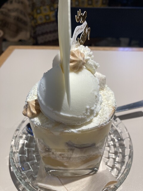 グラス上部のデコレートは塩ミルクアイスと洋梨シャーベット。背中にホワイトチョコをあしらい、中からトナカイが飛び出します。