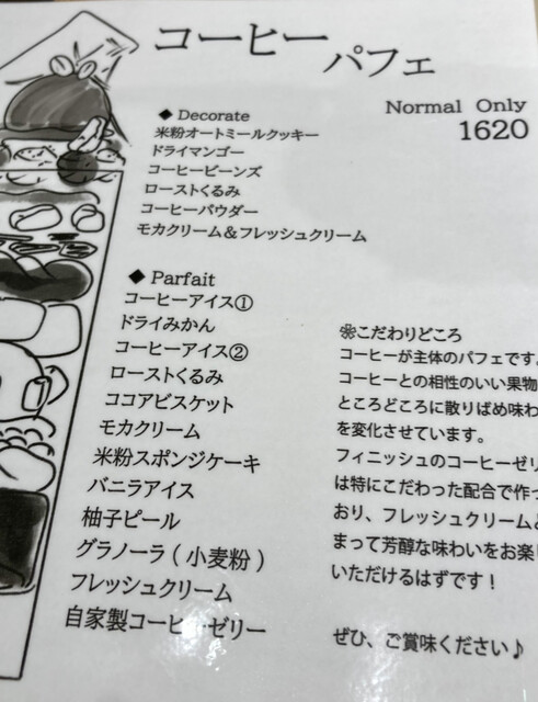 他にもココアビスケットや柚子ピールなどがメインの合間に顔を覗かせるので、パフェの中でゆっくりとコーヒータイムを過ごす空間を演出しているように思います。