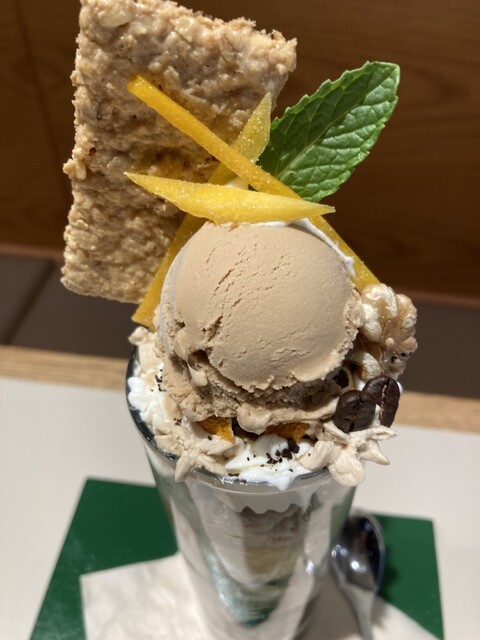 トップには極上のコーヒーアイスがコーヒービーンズ、ドライマンゴーを纏って乗っています。