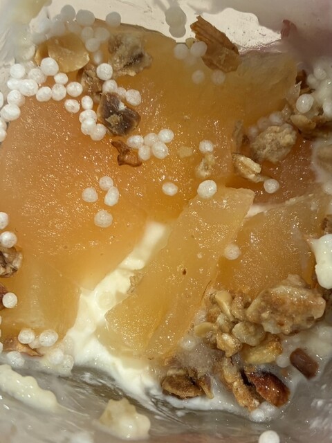 そこにシロップがかかったグラノーラ、柚子ソースでヨーグルトを盛り立ててくれます。ナタデココが食感の変化をもたらします。