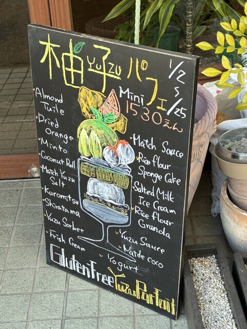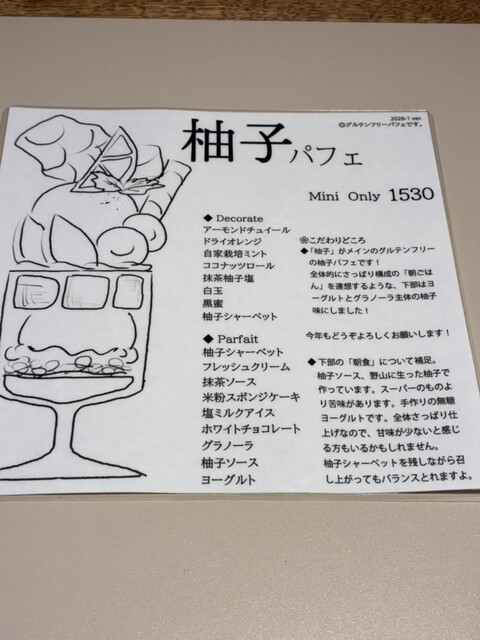 パフェを考案者は、正月のご馳走に対して「朝ごはんを連想させるグラノーラとヨーグルトを柚子の味にする」事であえて優しいパフェを目指したとパフェの解説にはあります。