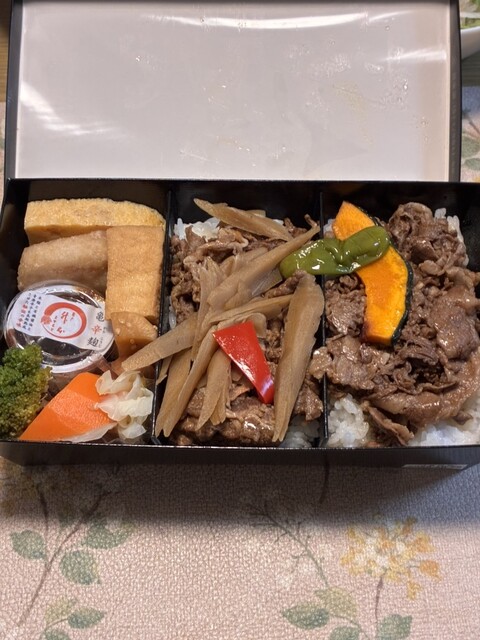 右から、牛飯、牛ごぼう飯、おかず