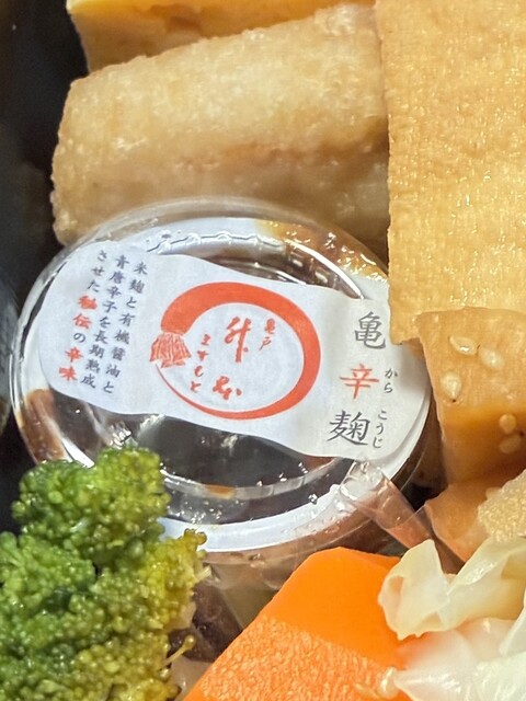 肉以外には、ごぼうすき飯・玉子焼き・野菜ピクルス・大根餅(桜海老入り)・厚揚げ・蒸し南瓜と入ります。おかずの味は名古屋のまつおかにも負けません。それと冒頭に記述しました亀辛麹が小さなカップで付属しています。