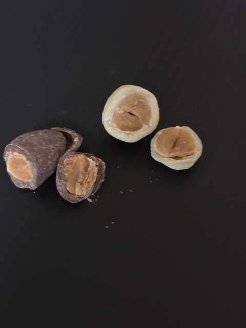 アーモンドを包むチョコレート、ヘーゼルナッツを包むホワイトチョコレート。