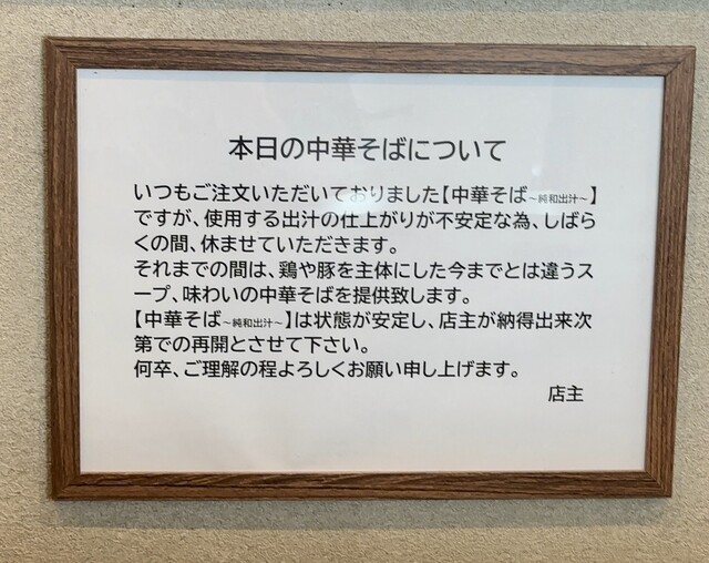 本日はほぼ埼玉県に近い群馬県太田市尾島にある中華そば屋さんに立ち寄りました。尾島交番の道を挟んで対面になります。冷製中華そば(15食限定)と、とろ玉子天ぷらをトッピングを注文しました。あまり冷製の中華そばを食べたことはありませんでしたが昆布出汁が効いたとても美味しいスープです。冷たさを保つように氷(出汁入り)が入っていて店主のこだわりが素晴らしいですね。生姜は昆布の風味を邪魔しないくらい抑えていると感じます。そして麺はコシが有りつつも、もっちりしたとても美味しい麺ですね。さらにこんな美味しい玉子の天ぷらは久々に食べました。個人的には是非また立ち寄りたいお店です。次回は温かい琥珀魚貝中華そばをいただきたいと思います。支払いは事前購入の券売機で現金のみになります。1000円札しか使えませんが、お姉さんに両替をお願いすれば快く両替していただけます。温かい中華そばを注文する方は一番左端のボタンを押しましょう。土曜日の昼間ちょうど12時過ぎの訪問ですが、満席+待ち合いスペースも満席でした。同僚によると天丼はすぐ売り切れててしまうそうなので早めの訪問がオススメです。駐車場は店前に5台、隣りの月極め駐車場に10台が駐車可能です。いつもの持論ですが厨房のステンレスピカピカのお店なのでこういうお店ではあまりハズレのお店はありませんね。ごちそうさまでした。