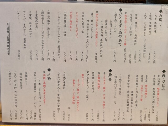 本日は、酒肴盛り合わせ(鴨ロース、あん肝、鶏胸肉のネギ山椒)、追加で鰹のニラ醤油掛けを注文。