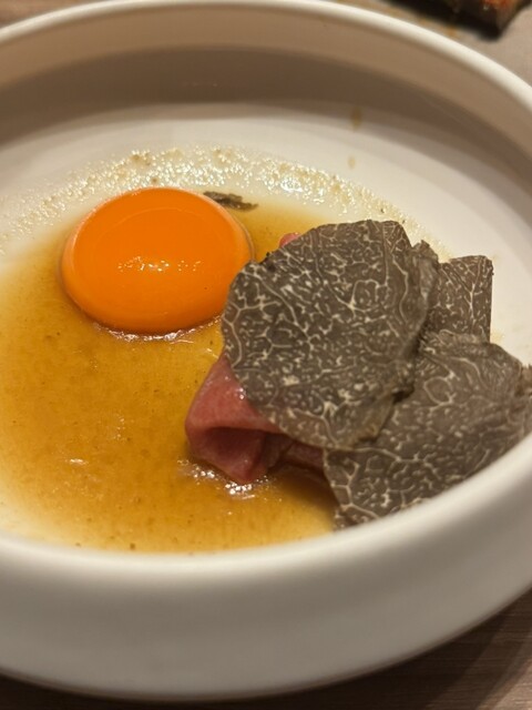 めちゃくちゃ火入れにこだわったシャトーブリアンのすき焼き風。肉の食感を感じられる火入れは素晴らしい。
