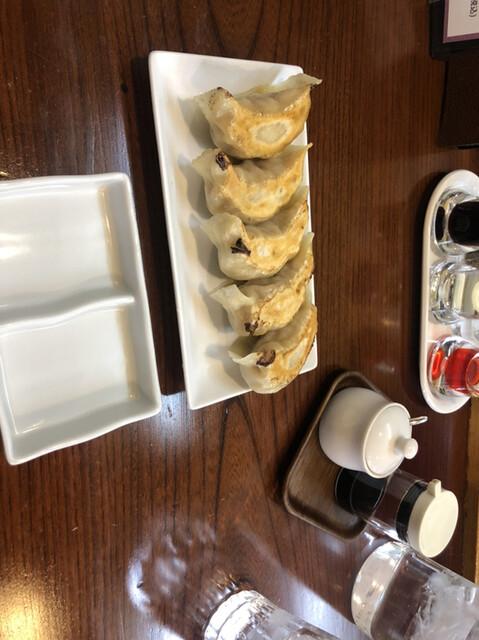 焼餃子と豆板醤(右の白い入れ物)と黒酢