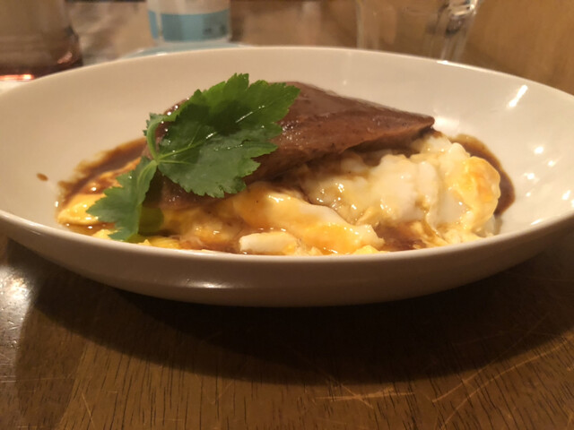 細長い器の中にはトロットロのオムライスが入っており、真ん中には牛タンが鎮座して、その周りにはシチューの様なタレがかかっている。真ん中の牛タンは圧巻で見応えあります。牛タンをスプーンで手頃な大きさに切り口に運ぶ。やわらかと言ってもスプーンで切るにはスプーンを何回か往復する必要があるが、食べるには柔らかさが分かる。歯で噛み切るのもあまり噛む必要が無いくらい。