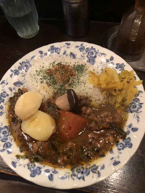 出来上がると、カレー皿にライスを盛り(綺麗に器にご飯を装ってカレー皿に盛った様に)空いてるところにカレーを入れてから従前から用意していたじゃがいも、人参等大きな野菜がゴロット入ったキーマカレーができ上がりカウンターの上に置くだけで店主は相変わらず無音。しばらく待つとポテトサラダを盛って出してくれる。またもや無音。