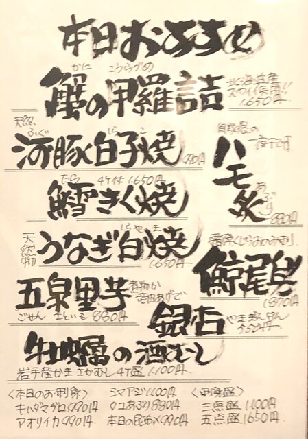 本日のおすすめから天然うなぎ白焼と河豚白子焼をもらいます。