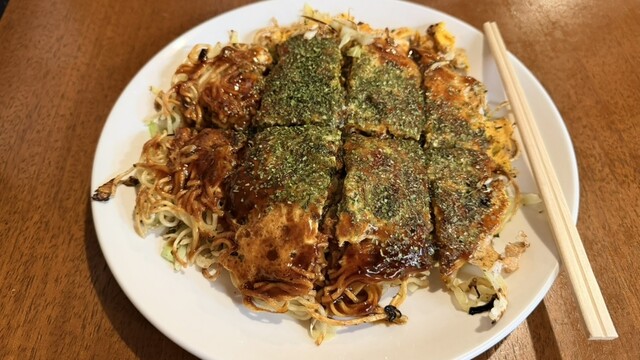 府中焼きなるお好み焼きをオーダー。見た目はいわゆる広島風お好み焼き。牛脂が入っているのが特徴とのこと。下地の粉や、上面の焼きそばはパリッとしていつつも中のキャベツはしっとり野菜の甘みを感じます。美味しいです。