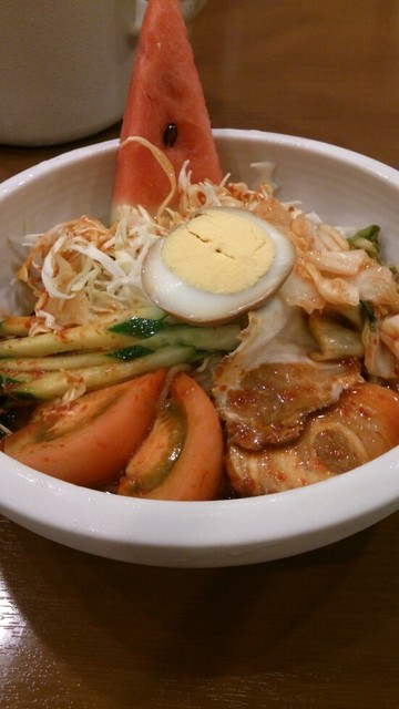 14時前に入店。カウンターはほぼ満席。期間限定の韓国風冷麺を注文。中辛と激辛が選べるが、激辛を注文。