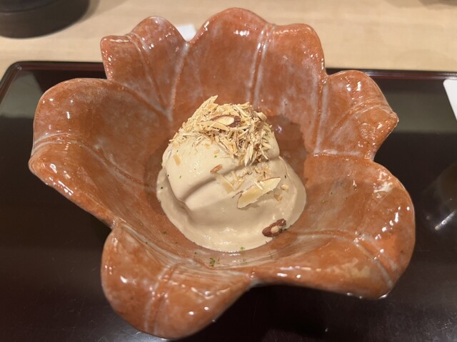・安久の定番の料理の一つ、胡麻和えのアーモンドがけ。以前は毎月くらい出される料理だったが、今回は無花果の胡麻和え。久しぶりで嬉しい。