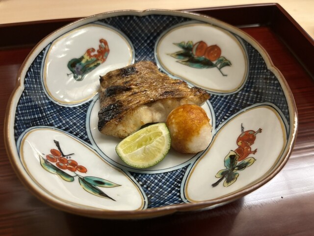 ・のど黒の塩焼き。大根おろしの中に細かく刻んだ山芋。のど黒は長崎などのものは脂が多過ぎるので、私は北陸のものが好み。美味しい