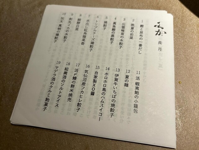 料理は、餃子・焼売・小籠包などの点心を、季節感のある素材に合わせた皮を作り、和風の出汁をベースに餡の味を整え、その場で包んで、蒸し・焼き・茹で・揚げなどの調理法で提供される。