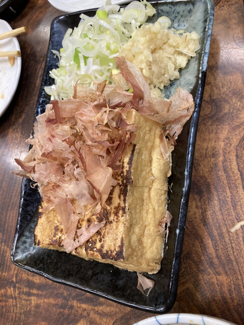 やっぱりピーマンの肉詰め、鶏皮ポン酢、イカとタコの刺身、ポテトサラダ、厚揚げ、ししとう、ネギ焼き、どれも美味しい〜。
