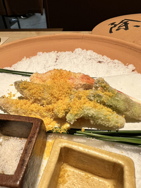薄い衣は米粉かなー…もちもちサクサクしっとり美味い✨からすみをどサリとかけて旨味をプラス!蟹爪ふわふわ甘くて(*´ч`*)ウマー鰙と楤の芽も苦味がほんのり美味しいなーー