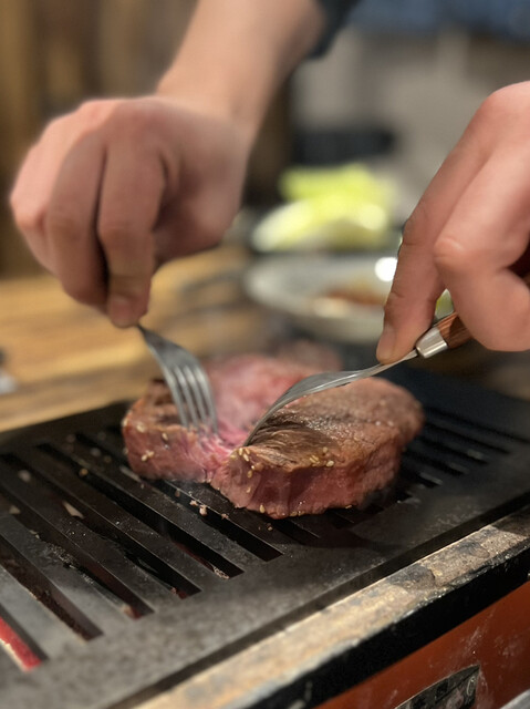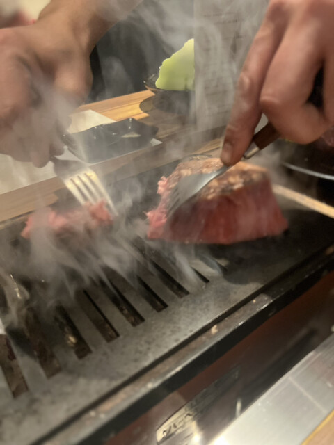 目の前でぶっあつい!200gのステーキをナイフを使わず2本のフォークでさく‼️見たことの無い肉カット✂︎✨️感覚的にはコーンビーフをフォークで割いた感じ✨️肉の塊を切ってるとは思えないほど上質な感じが見た目でビンビン伝わってくるぅーー♡