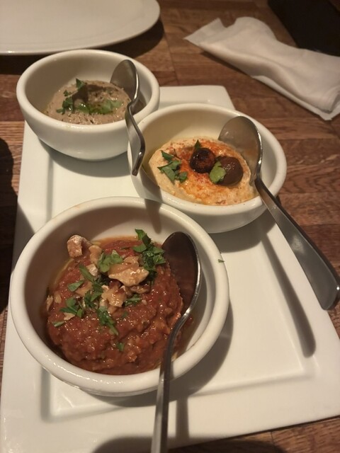 前菜のディップ3種(ハムス、ババガヌーシュ、ローストペッパーのもの)に添えられたパンが驚異的に美味で、ついついおかわりしてしまった。ここでようやく「ハムスはパンの引き立て役ではない。むしろ、パンの名脇役だ」と気づく。