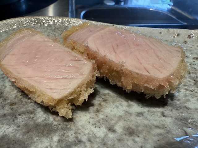 昼からマリアージュを楽しむ、ワインはシャンパーニュを含め6種類、、まあ、これがなかなかなの値段、でも頼まないわけにはいかない。とんかつは3種類、、どれも美味い。私はやはり塩派ではなく、そーす、醤油派なので、そちらに旨みを感じた。ワインとバッチリかはちとわからないが、ワインもなかなか美味かった。野菜は2種類、えんどう豆が絶品、こりゃ美味い。さらにオプションで、マッシュルームと香川産のアスパラガス、、アスパラも美味だった。最後は締めで、卵でとじないとんかつ、カレー味のメンチカツを混ぜ合わせるものを選択。少なめで両方頼めるオプションあり。もちろん両方食べる。こらがまた絶品。後半は貝出汁のお茶漬けにするが、こらも、にっこり。
