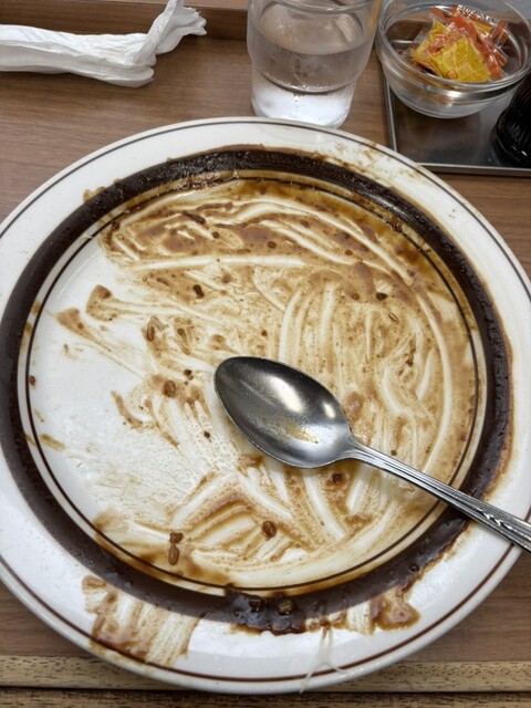 平日の14時35分に訪問。前の並びは5名くらいで並ぶことに、14時39分に中に入れました。かつカレー850円を注文。安くなるわけでは無いですが食べきれないのでライスの量は半分でお願いしました。5分強で到着。凄い量。昔は知らなかったですが、これは金沢カレーなのでしょうか?黒いルーに刻んだキャベツが乗っていて金沢カレースタイルですね。かつとキャベツにソースをかけて、福神漬けも多めに入れます。一味も全体にふりかけます。凄く美味い。コスパ最強かつカレーといえば、ここか同じく神保町にあるまんてんかですね。ライスを半分にして正解。それでも通常サイズのカレーより大きいかも。美味いしデカいしこれで850円。信じられません。ご馳走様でした。