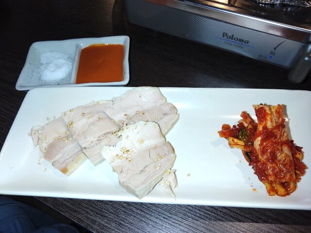 鍋ができるまでのあいだの待ち時間は、蒸し豚。まずは塩で、柔らかさと肉質の良さを感じます。2枚目からは、タレとキムチであっさりした肉によく会います。