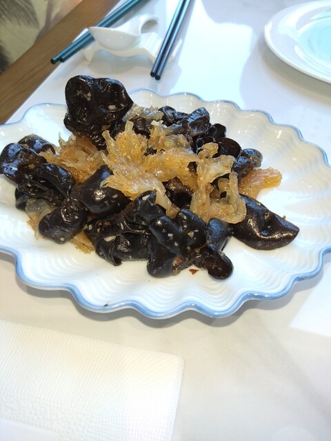温かい前菜のブロッコリーと揚げの煮物意外とこれが一番やったかも、冷たい前菜は、きくらげの煮物、食べやすくておいしかった。