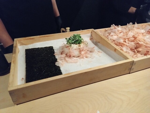 一口食べると、そのおにぎりの概念が覆されます。お米が口の中でハラハラと優しくほどけるような、絶妙な握り加減に感動しました。素材の味を最大限に引き出す「引き算の料理」というコンセプト通り、余計なものが一切なく、ただただ素材そのものの美味しさが際立っています。特に「マグロと漬け卵」は、濃厚な旨みが口いっぱいに広がり、思わず「美味しい!」と声が漏れてしまうほどでした。さらに、香り高い削りたての揖宿(いぶすき)産かつお節が使われているおにぎりもあり、その豊かな風味には舌を巻きました。
