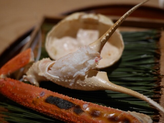 まずは立派な間人蟹がお出迎え。美しく盛り付けられた香箱蟹に待ちきれず食べ始めると、すぐに七輪が登場して追い焼き松葉蟹。最初から全力で畳み掛けてくれるのが松川さんらしさ。惚れてまう。豪快に口中にほうばると甘味が一杯に溢れて至福が訪れる。柔らかに蒸された鮑にキャビアの塩味、真鯛の口どけも素晴らしい。お椀は毛蟹真丈に松茸。香ばしく焼かれた松茸が晩秋の余韻を残して香り、毛蟹の甘味が冬の訪れを告げる。その吸地は五感を研ぎ澄ましてようやく感じることの出来る繊細な味わい。感無量。河豚のお造りに唐墨餅と日本酒が止まらない。ここで松葉蟹がお造りで再び。一瞬で口中から溶けて無くなり、旨みだけが記憶に刻まれる。その儚さは夢幻の如くなり。焼物は真魚鰹とすっぽん。個人的に当店のすっぽん焼きは日本一。名残の松茸もフライで再び。もはや今年度の松茸に思い残すことなし。自家製ソースまでが美味しすぎた。〆のお食事はおかわりして3杯。束の間の幸せな時間に心より感謝です。