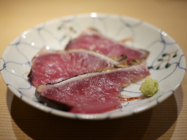 ツマミは前回に引き続き蛸の唐揚げがツボ過ぎる。これ山盛りテイクアウトして自宅でまったり映画とか観れたらこの世の天国なやつ笑。ニタリクジラも驚くほど旨くて過去一。鯨はもう当店以外では食べたくないな〜とまで思えてしまう。名物カツオの藁焼きは写真見ると天本ちゃんの手も、もれなく焼けてる…?近火の強火にも程があります笑。珍しいツマミでは行者ニンニクと浅蜊の酒蒸しなんかも日本酒が止まらない旨さ。毎度のことながら、鮨屋でこのツマミの完成度。