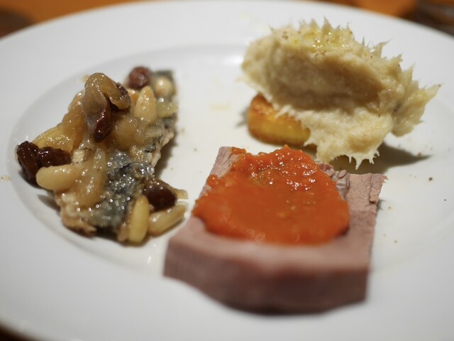 水牛モッツァレラに冷たい洋梨の甘さとシャリシャリ食感が空腹の胃袋をくすぐる心地良いスタート。のっけからワイン止まりません。〆鯖とバジルソースのブルスケッタ。シンプルなのにこの旨さ。絶妙な〆加減、ソースの塩味、一口の中で完璧にまとまって着地。待ってましたのバスク豚ロースト。永遠にワインと行ったり来たりしたいトンナートソースのやみつきさよ。シェフが見ていない隙をついてこっそりペロペロが止まらない笑。ライスコロッケなど3種盛り合わせ。この時点でワイン何杯飲んだかな。シェフがグラス空いたら直ぐに注いでくれるので1種類で最低2杯は飲んでいるから結構な量。美味しいものを食べて飲んで、仲良し友人達との会話も楽し過ぎて時間が経つのもあっという間です。迫力ある白子のフリットはリゾットにオンザライス。もうこれ見た目の絵的にも最高ですが、金目鯛の出汁が贅沢に引かれたリゾットの旨味にまた悶絶。盛り付けのボリューム感がいちいちツボ過ぎて好み。サクサクっと軽やかなフリットに身厚の穴子はサツマイモの甘みにピスタチオの香ばしいアクセント。メインは木下牛3種盛り。完璧な火入れと口どけ。それぞれのソースがまた手が混んでいてワイン飲ませるよね。フリーフロー的に飲んでいたらバローロ2019とか開いてるし。〆タヤリンは普通盛りオーダーしちゃったけど後悔しまくり。次回は忘れずに超盛りで!(*´Д`*)
