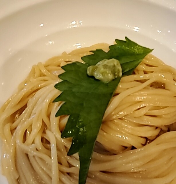 自家製の細麺、ほんのり色もついて、大葉にわさびが添えられて‼️