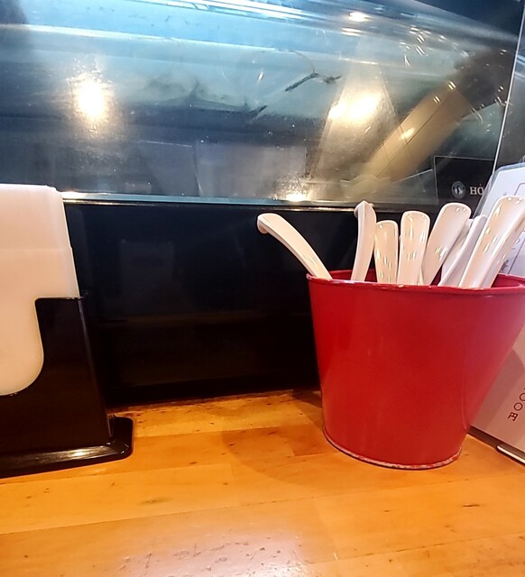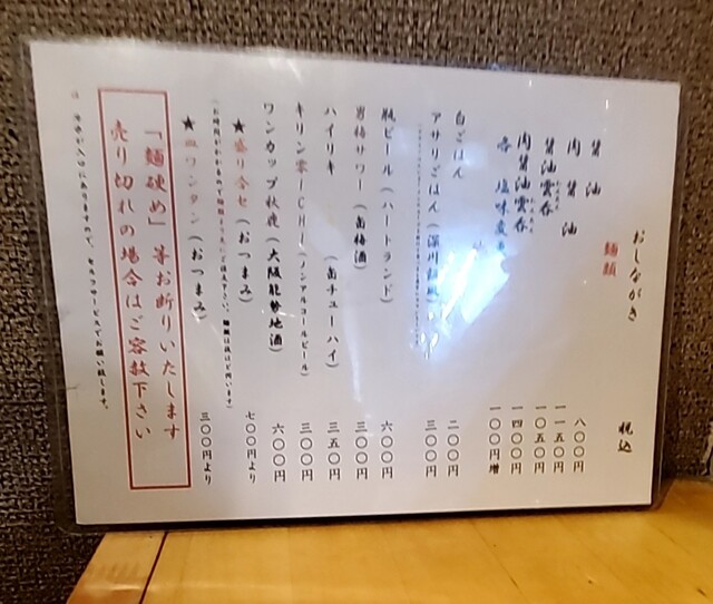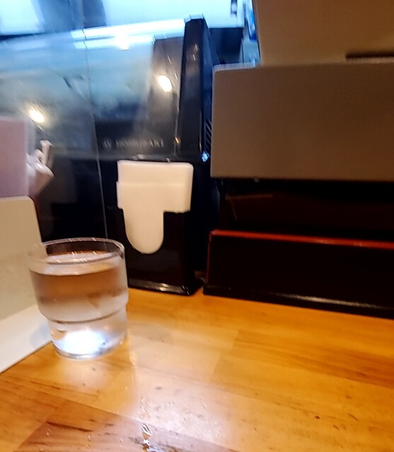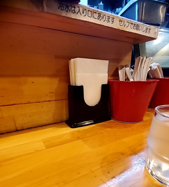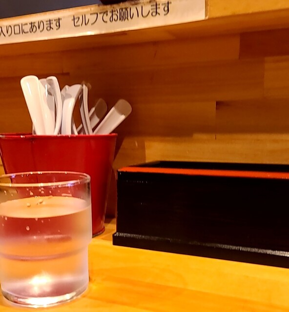 店頭には待ち無し、店内へ、一列のカウンター、セルフのお冷やを頂いて座ります。