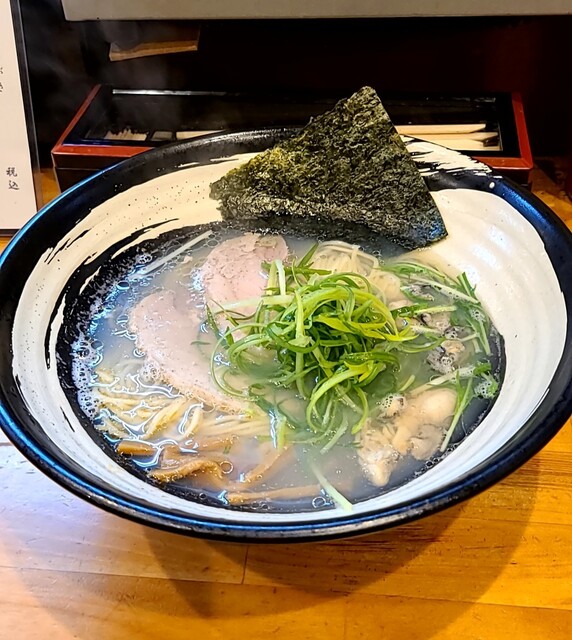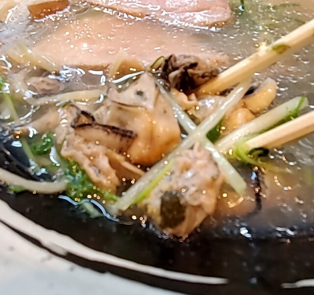 鶏と昆布、鰹節、鯖節で取られた、塩清湯スープ‼️小粒の大量の牡蠣‼️牡蠣の出汁もきいて美味しいですね‼️