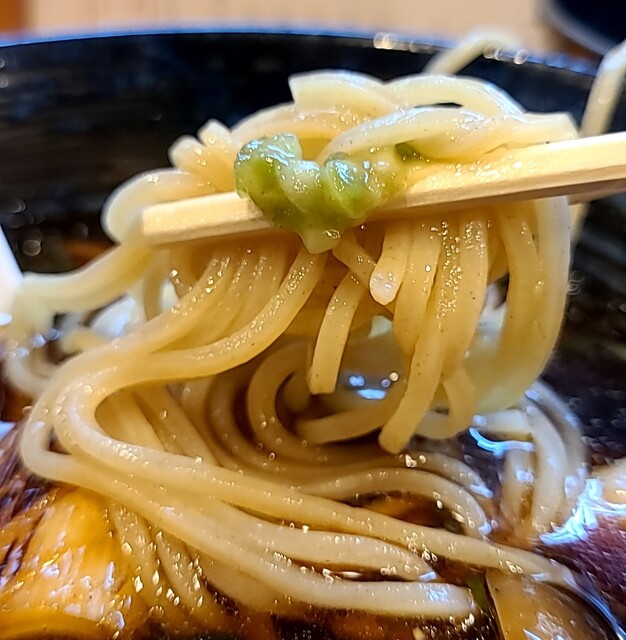 スープは鴨蒸籠のような甘味と辛味が合う、山椒のきいた美味しいスープ、麺にスープが良く絡んで美味しいです。