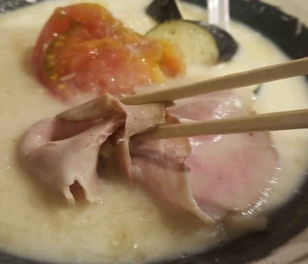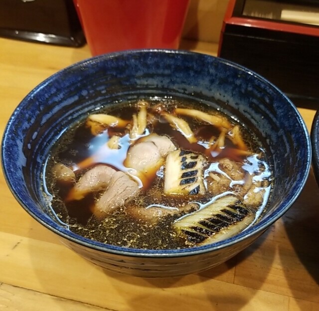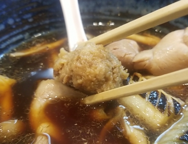 大きめのチャーシューに、しめじに焼いたネギが入り、合鴨のつくねも入って、つくねの食感も良いですね。