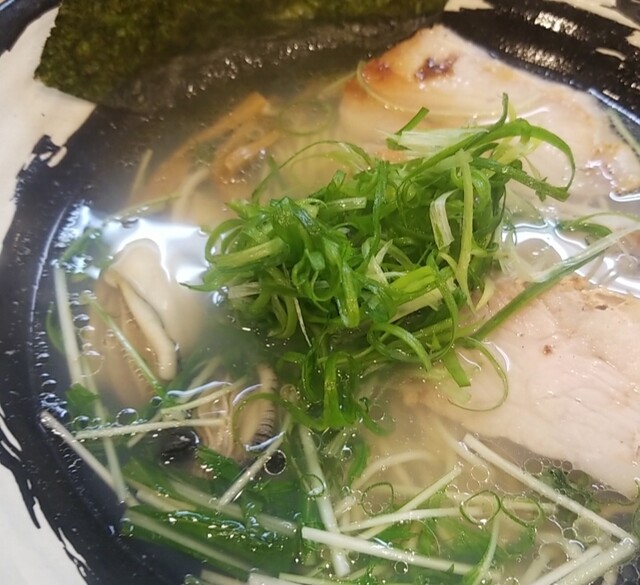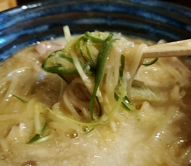鶏といろんな節系に昆布をきかせて、塩味は強めのスープ、チャーシューネギにメンマ、白子が入り、自家製の平打ち中太麺です。