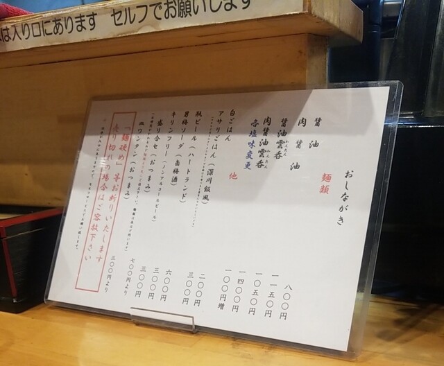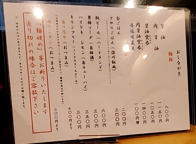 レギュラーメニュー、醤油、肉醤油、醤油曇呑、肉醤油曇呑、塩は各100円増しです。