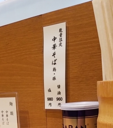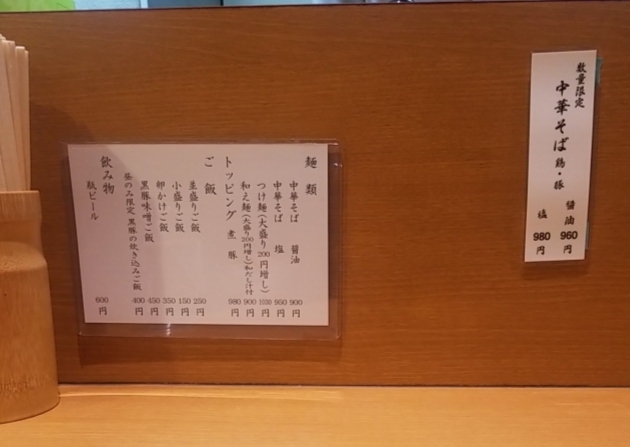 待ってる間にメニューを、中華そば醤油、中華そば塩、和え麺、つけ麺、数量限定の鶏豚中華そば醤油、鶏豚中華そば塩ですね。