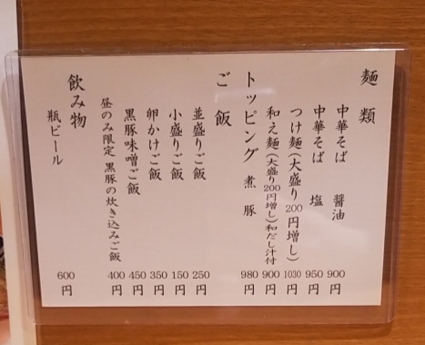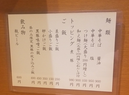 メニューは中華そば醤油、中華そば塩、つけ麺、和え麺、中華そば鶏豚醤油、中華そば鶏豚塩ですね。