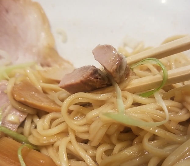 和え麺は初めにしっかり混ぜて、ネギとメンマとこま切れチャーシューを一緒に、美味しいですね、普通のチャーシューも柔らかく美味しいです。