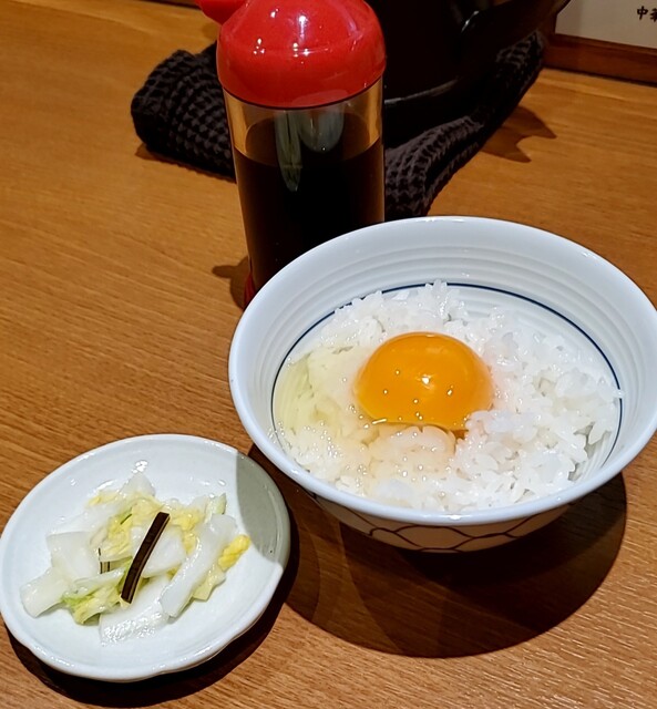 一緒に卵かけごはん、醤油をかけて良く混ぜて美味しい、一緒に白菜の浅漬も良い箸休め、洗練された美味しい一杯でした‼️